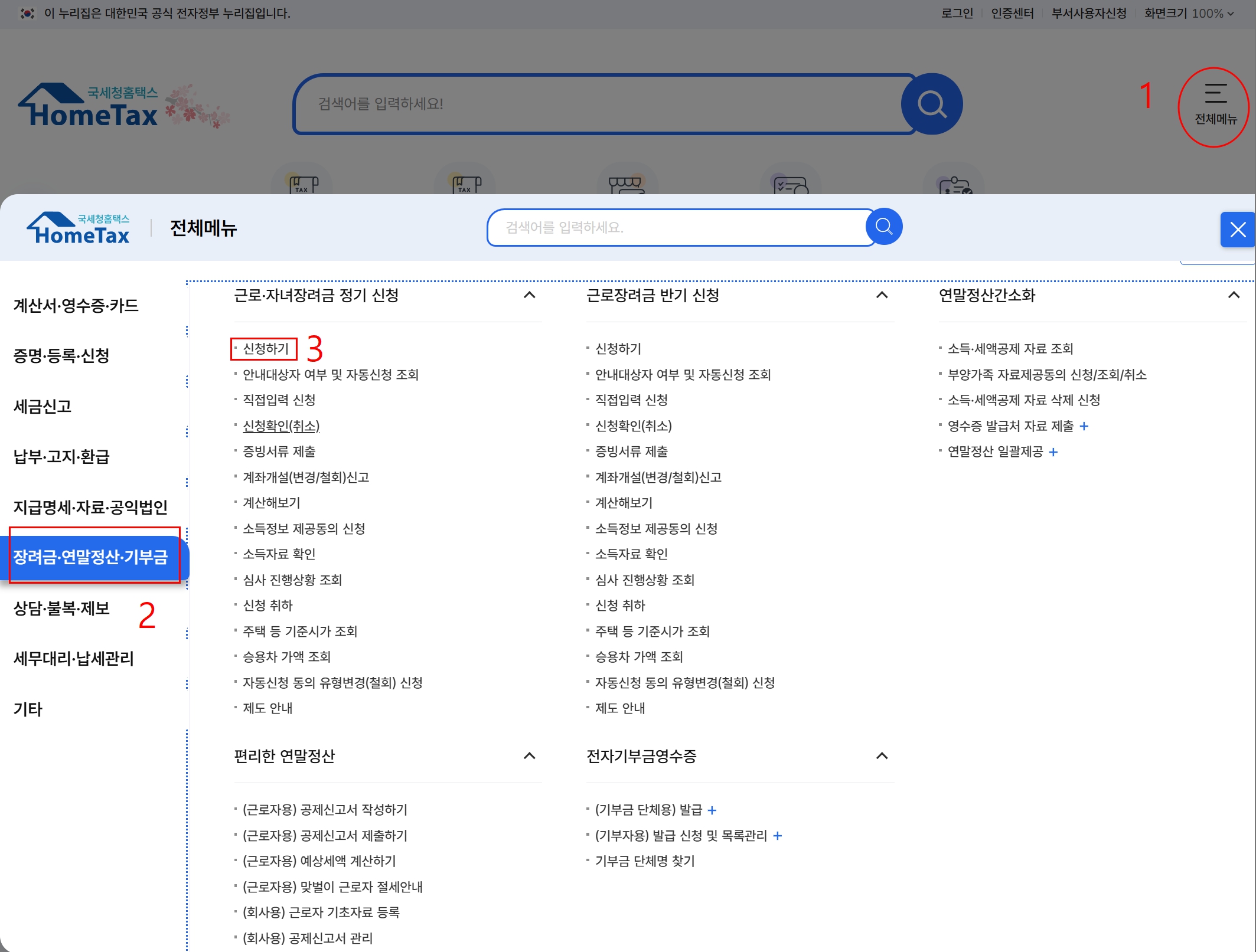 - * 홈택스 로그인 → 장려금ㆍ연말정산ㆍ전자기부금 → 근로ㆍ자녀장려금 정기신청 → 신청하기