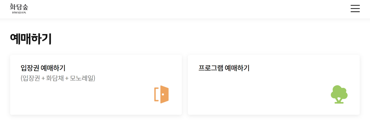 - 화담채 원하지 않을 경우: 입장권만 예매 버튼을 눌러 화담숲 입장권 예매 또는 모노레일 예약을 진행하면 됩니다.