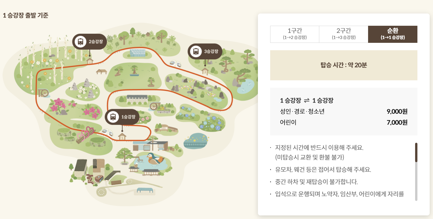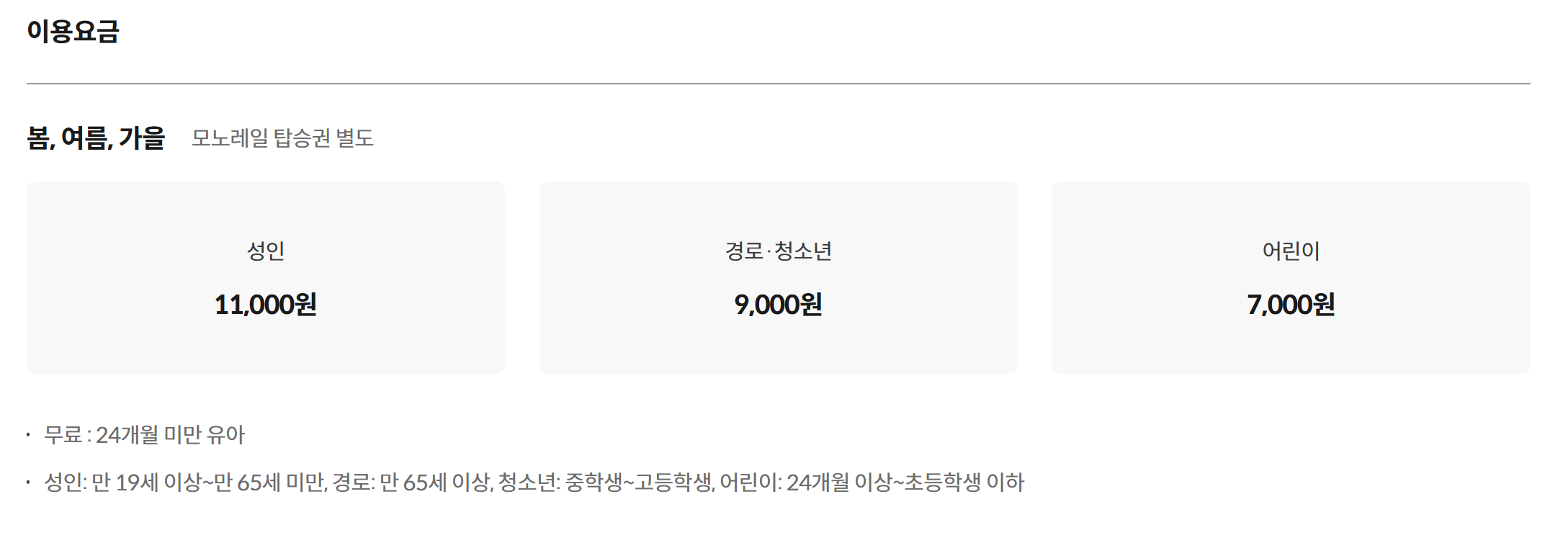 - 모노레일 3구간 이용료 : 성인 · 경로 · 청소년 9,000원 / 어린이 7,000원 (화담숲 이용요금과 모노레일 탑승권은 별도입니다)